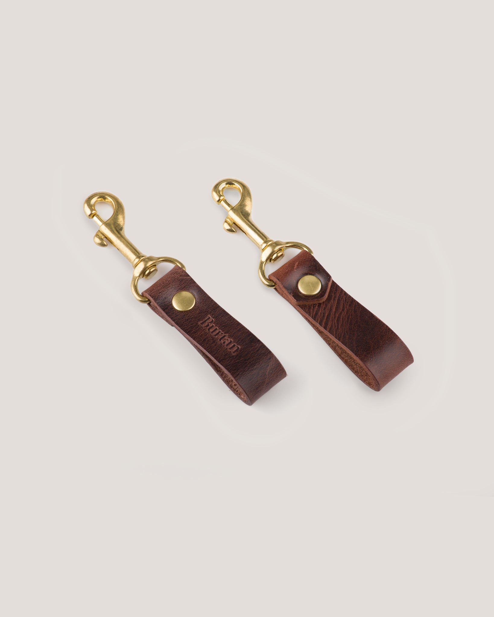 Estetyczny, skórzany brelok z mosiężnym karabińczykiem, który ułatwia wygodne przypinanie. Brelok można nosić osobno lub wsunąć na pasek jak dodatkową szlufkę.